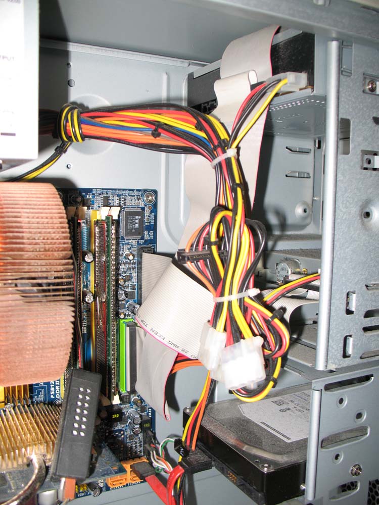 С прокладкой проводов и шлейфов полная беда. Они у тебя наверняка сильно мешаю воздухотоку. Надо что-то делать. Надо их более компактно захомутать и сложить. Шлейфа к хардам и оптическому приводу нужно переложить как-то покомпактнее. Только не вздумай их вдоль сворачивать.